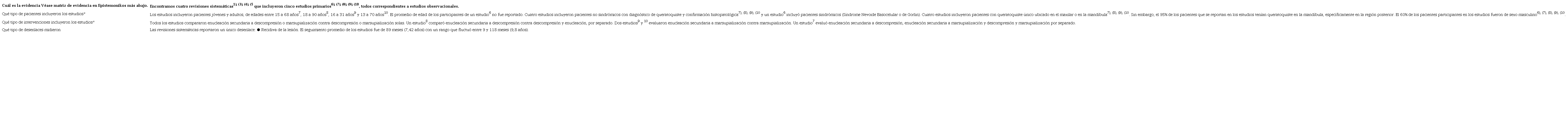 ● No existe claridad respecto a la efectividad o seguridad de la enucleación secundaria a descompresión o marsupialización como tratamiento de queratoquiste, porque la certeza de la evidencia es muy baja. Adicionalmente, no existe evidencia respecto al efecto de la intervención sobre dolor postoperatorio, infección o fracturas patológicas de los pacientes con queratoquiste, ya que estos desenlaces no fueron presentados en la evidencia analizada.