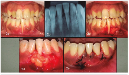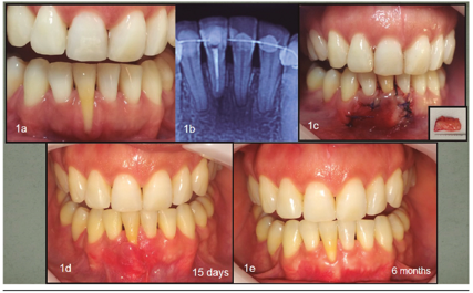 Scaling and root planning was performed with a Gracey 5-6 curette and then a partial thickness flap was made from the mesial of tooth 43 to the mesial of tooth 42, preserving a margin of KT on the buccal face of this tooth. A connective tissue graft of the palate was obtained with the trap-door technique13 which was fixed to the root of tooth 41 with 5-0 Vicryl wire. Subsequently, the flap was positioned laterally over the graft and fixed with 4-0 silk thread (“Figure 1c”), which was removed 10 days later. Postoperative care included 0.12% chlorhexidine mouthwash and use of analgesic and anti-inflammatory drugs. The use of pre-surgical anti-inflammatory reduces morbidity after surgery, confirmed by the slight discomfort in the palatal area, reported by the patient. “Figure 1d” shows the postoperative period at 15 days, and “Figure 1e” at six months, showing partial coverage (over 70%, with a final GR = 3mm), and KT increase (gain of 4 mm). At the final clinical examination, the PD on the buccal surface was 1 mm, and in others surfaces = 2 mm.