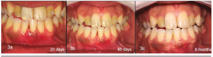 Scaling and root planning was performed with a Gracey 5-6 curette and then a partial thickness flap was made from the mesial of tooth 33 to the mesial of tooth 32, preserving a margin of KT on the buccal face of this tooth (“Figure 2c”). A connective tissue graft obtained from the palate was obtained using the trap-door technique that was fixed to the root of tooth 31 with Vicryl 5-0 suture (“Figure 2d”). Subsequently, the flap was positioned laterally over the graft and fixed with 4-0 silk sutures (“Figure 2e”), which was removed 10 days later. Postoperative care included 0.12% chlorhexidine mouthwash and use of analgesic and anti-inflammatory drugs. In this clinical case, no postoperative morbidity was observed. “Figure 3a” shows the postoperative period at 20 days and the “Figure 3b” at 45 days. The “Figure 3c” presents the clinical condition at six months, with 100% of root coverage (GR =0, PD = 1 mm on all surfaces), and gain of KT = 4 mm. The dentinal sensitivity disappeared.