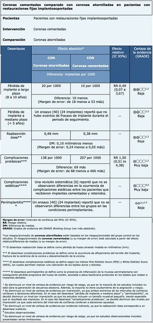 ● No es posible establecer con claridad si las coronas cementadas disminuyen el riesgo de complicaciones estéticas y protésicas, debido a que la certeza de la evidencia existente ha sido evaluada como muy baja.