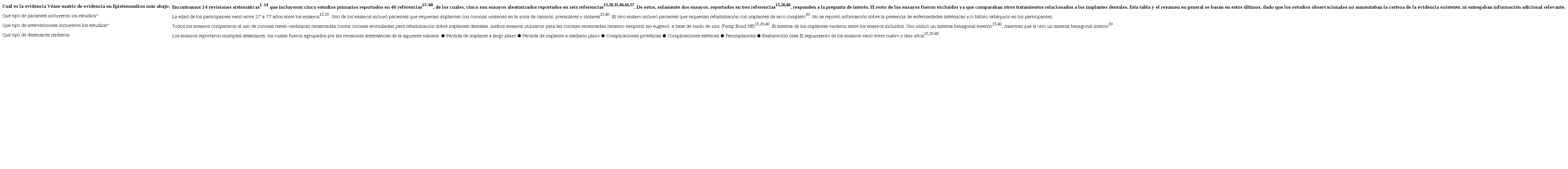 ● El desenlace reabsorción ósea fue incluido en la tabla de resumen de resultados debido a que se trata de un desenlace relevante para los expertos clínicos, aún cuando se trata de un desenlace sustituto de periimplantitis.