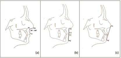 Prominencia Labial (Burstone) (Figura 3b): Se midió desde el labio superior y labio inferior a la línea Sn-Pg’.