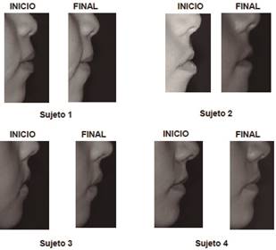 Visualmente también se observaron cambios positivos en los voluntarios a lo largo de las sesiones de TM, principalmente en la posición de los labios de cada paciente (Figura 4); a pesar de ello, esto no tiene correlato estadístico.