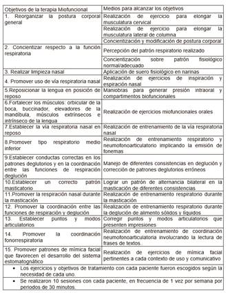 La TM aplicada en este estudio, fue el protocolo de terapia para tratamiento de respiración oral adaptado por Prof. Flga. Lorena Sepúlveda, Facultad de Odontología, Universidad de Chile, según su experticia, a partir de Korb8, Universidad de Sao Paulo (Tabla 1).