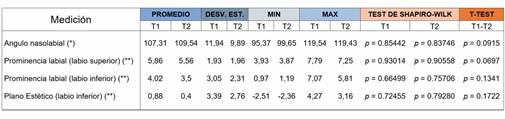 Para cada una de las cuatro variables cefalométricas: Ángulo Nasolabial, Prominencia Labial: Labio superior y Labio Inferior y Plano Estético: Labio inferior, se realizaron mediciones al inicio del tratamiento (T1) y al final de este (T2), obteniéndose un total de 120 registros, que se utilizaron para los análisis estadísticos.