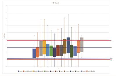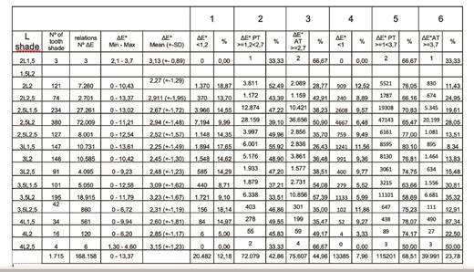 In the L shades, 12.18% of our ΔE values are lower than ΔE PT described by Paravina et al17; 42,86% are >=1,2 and <2,7 and 44,96% of our values are equal or higher than the ΔE AT of 2.7 obtained by the same authors.