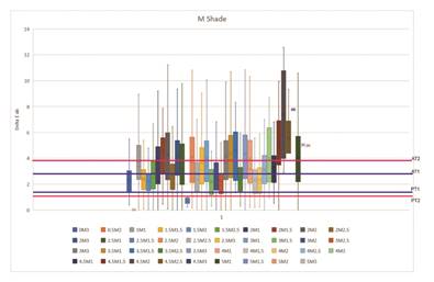 The results of the Vita 3D Master Shade L, M and R are presented in Tables 1,2 and 3. Graphs 2, 3 and 4 represent the values presented in the corresponding tables.
