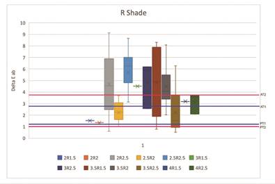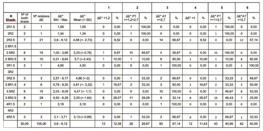 When we study each shade independently, we observe that in the R shades, 12.38% of our ΔE values are lower than ΔE PT described by Paravina et al17; 26.67% are >=1.2 and <2.7 and 57.14% of our values are equal or higher than the maximum reported ΔE AT of 2.7. On the other hand, 11.43% of our ΔE values are lower than ΔE PT described by Khaskayar et al13; 40.95% are >=1 and <3,7 but 40% of our values are equal or higher than the ΔE AT of 3.7 obtained by them27.