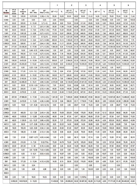 Data was tabulated in number of teeth with a determined tooth shade, ΔE minimum and maximum, ΔE mean value for each shade and standard deviation, number of teeth within the ΔE ranges of the PT and the AT according to Paravina et al17 and according to Khaskayar et al13. See tables and graphics.