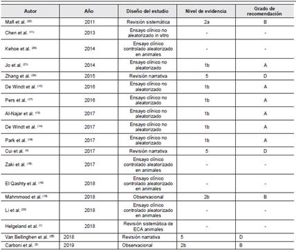 Los tipos de células madre mesenquimales más utilizados en los artículos seleccionados fueron: Bone Marrow Mesenchymal Stem cells (BMMSCs)11-16, Adipose Derived Stem Cells (ADSCs)2,17,18 y Human Umbilical Cord Mesenchymal Stem Cells (HUCMSCs)19 , cuyas ventajas corresponden a su potencial de diferenciación en múltiples linajes celulares, su efecto antiinflamatorio y antiinmunomodular y su capacidad de formar componentes cartilaginosos y óseos cuando son combinados con los andamiajes correctos4.