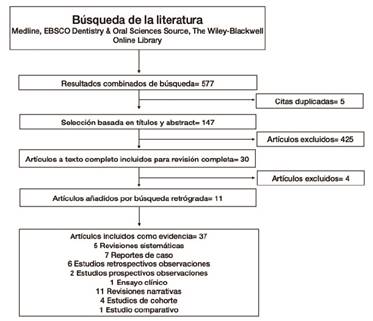 Quedando un total de 37 artículos finales, de los que 5 corresponden a revisiones sistemáticas, 7 reportes de caso, 6 estudios retrospectivos observacionales, 2 estudios prospectivos observacionales, 1 ensayo clínico, 11 revisiones narrativas, 4 estudios de cohorte y 1 estudio comparativo. (Tabla 1)