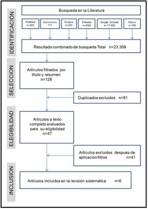 La búsqueda sistemática identificó 128 estudios por título, de ellos 6 superaron todos los filtros para efectuar la revisión sistemática (Figura 1), todos ellos fueron ensayos clínicos aleatorios (ECA).