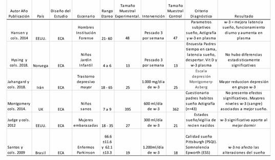 Conclusión: Omega-3, como suplemento dietético o directamente en los alimentos, interviene como coadyuvante para mejorar el sueño. No se pudo concluir sobre su recomendación de uso clínico en la gestión del sueño debido a la heterogeneidad de las metodologías para medir la intervención, las poblaciones estudiadas y cantidad de ingesta. Se necesitan estudios con mayor estandarización metodológica, para determinar dosis óptima, período de intervención y proporción de ácidos eicosapentaenoico/docosahexaenoico, necesarios para mejorar la calidad y la cantidad del sueño.