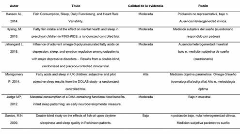 Métodos: Se realizó la búsqueda sistemática de artículos (2010-2019), incluyendo pacientes sin limitación de edad/sexo, sometidos a cambio o suplemento de dieta con omega-3 y evaluaciones de sueño. La revisión se realizó bajo los criterios PICOT y PRISMA, la calidad de la evidencia y riego de sesgo fueron evaluados con criterios GRADE.