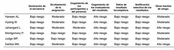 Los riesgos de sesgo según criterios GRADE determinaron que dos estudios fueran clasificados como moderado riesgo de sesgo13,15, 3 como alto riesgo11,14,16 y 1 en nivel de no cumplimiento12 (Tabla 3).