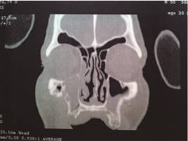La Tomografía axial Computada (TAC) reveló una sinusitis hemimaxilar y etmoidal derecha sumado a una lesión osteolítica ipsilateral que compromete hasta el piso de la órbita (Figura 2).