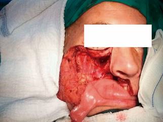 Se realizó una resección quirúrgica con abordaje de Weber y Fergusson, disección Nasogeniana lateral hasta exposición amplia de plano óseo comprometido con lesión, encontrando, además, compromiso malar, de arco cigomático, piso orbitario en su segmento medial (Figura 3). Por consiguiente, se decidió realizar una Maxilectomía subtotal derecha y una cobertura de la cara medial del colgajo miocutáneo con injerto dermoepidérmico tomado de muslo izquierdo. En la biopsia diferida tomada en el acto quirúrgico se describió la presencia de elementos con morfología Mucor a nivel de tejido óseo y proceso inflamatorio crónico activo granulomatoso.