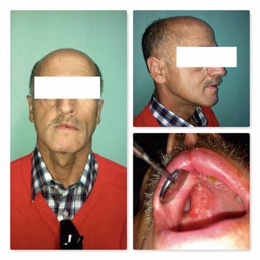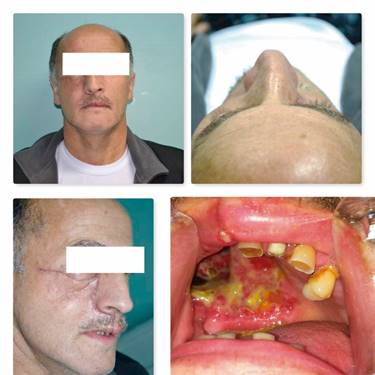 Al examen físico se observó aumento de volumen hemifacial derecho con borramiento del surco nasogeniano ipsilateral. Intraoralmente, se observó exudado purulento en sitio de exodoncia y a través de drenaje palatino, comunicación oro-antral y ósea al medio bucal de aspecto necrótico (Figura 1).