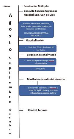 Paciente género masculino, de 55 años, ingresa al Servicio de Cirugía y Traumatología Máxilofacial del Hospital San Juan de Dios, Santiago de Chile, refiriendo que fue sometido a exodoncia de molar maxilar derecho hace 2 meses, que evolucionó con exudado purulento y dolor de tipo pulsátil, de intensidad EVA 8/10, intermitente, localizado en hemimaxilar derecho irradiado a región cigomática y palatina ipsilateral, que no cede frente a analgésicos. Acude con drenaje tipo Penrose y con antibioterapia empírica con Azitromicina y Metronidazol 500/500 mg ya iniciada evolucionando tórpidamente.
