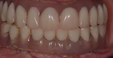 Desde la inserción de prótesis provisionales fijas, se le indicó a la paciente el uso de irrigador bucal (Waterpik®, Dentaid®) e instrucción de higiene. Una vez dada de alta, fue controlada de manera regular cada 6 meses, recibiendo en cada ocasión higienización mediante el uso de Cavitron®, Dentsply Sirona®. Ambas prótesis fueron retiradas una vez al año para una limpieza profunda tanto de los pilares como de las prótesis híbridas, mediante ultrasonido, siendo la figura 1 fotografías del control a 5 años previa y posterior a la fase de higienización de ese control (fig. 1.a y 1.b respectivamente). Además del recambio de tornillos protésicos, se examinaron tanto los componentes protésicos como los tejidos periimplantarios, siguiendo la metodología descrita por Berglundh y cols10. En ninguno de los controles se encontraron fallas en los componentes protésicos (fig. 2), ni en la superestructura o sistema de conexión, no existiendo tampoco algún tipo de alteración sensorial. Los tejidos blandos periimplantarios (fig. 3) tampoco presentaron alteración, no observándose signos de periimplantitis o daño en los implantes ni en los pilares protésicos.