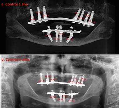 La evaluación radiográfica se realizó utilizando tomografías computarizadas (Cone beam CT) y radiografías panorámicas. Para la evaluación del hueso crestal se tomaron como referencia el examen Cone beam CT tomado post rehabilitación y la radiografía panorámica a 5 años (fig. 4). Hay que tener en cuenta que el corte tomográfico utilizado en la figura 4.a sólo muestra una dimensión en su sección coronal y que la radiografía panorámica se obtiene con una superposición de las estructuras presentes y es muy sensible a sufrir distorsión por el posicionamiento del paciente, por lo que pueden existir variaciones en las dimensiones obtenidas. Se observa que en general existe una disminución de la cantidad de hueso en la zona crestal en la comparación de ambas imágenes (fig. 4) tendiendo a ser mayor en la zona maxilar que en la mandibular. Se utilizó el software Romexis para realizar las mediciones.
