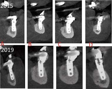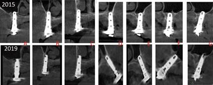 Las figuras 5 y 6 corresponden a los cortes tomográficos obtenidos en el año 2015 en comparación con el año 2019, donde se pude observar la estabilidad dimensional del hueso crestal en los cinco años post alta del paciente y la leve remodelación ocurrida en este período de tiempo.