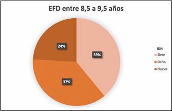 Adicionalmente, se analizó el grupo de niños entre ocho años seis meses y nueve años seis meses, donde aproximadamente un 39% presentó un estadio de formación dentaria en 7 de Nolla (menos de la mitad de formación radicular) y un 61% presentó un estadio de formación dentaria entre 8 y 9 de Nolla (más de la mitad de formación radicular) (Gráfico 1).