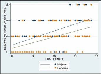 En la distribución de estadio de formación dentario según género, se observó que el género femenino tuvo un estadio de formación dentaria más avanzado que en el género masculino, principalmente desde los nueve años, representado en el gráfico de regresión lineal (Gráfico 2). Al comparar las pendientes se observó que hay diferencias significativas entre hombres y mujeres (p < 0.05).