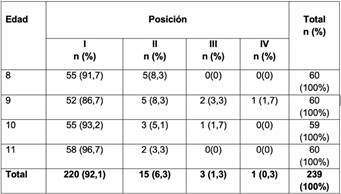 En el análisis de la posición del CMP respecto a la edad cronológica, se observó que un 92,1% de las radiografías evaluadas el CMP se encontró en una posición I, un 6,3% en posición II, 1,3% en posición III y un 0,3% en posición IV. La distribución de la posición del vértice del CMP entre las edades seleccionadas es homogénea. Por ende, no existen diferencias estadísticamente significativas al evaluar la posición del CMP según el método de Lindauer a los 8, 9, 10 u 11 años (p = 0.505). El análisis estadístico utilizado fue el test exacto de Fisher (Tabla 1).