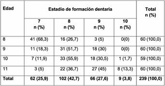 La muestra se compuso de 239 radiografías panorámicas, de las cuales 60 eran de niños de ocho años (25,1%), 60 de nueve años (25,1%), 59 de 10 años (24,7%) y 60 de once años (25,1%). Del total de la muestra un 49,8% correspondieron a mujeres y un 50,2% a hombres, por lo que la base de datos se distribuyó homogéneamente según género.