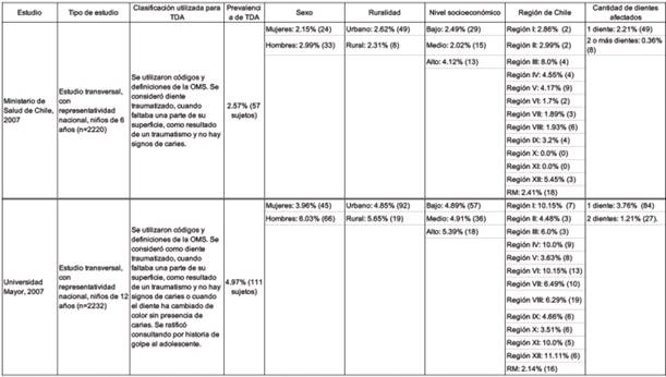 Onetto et al. 199413, realizaron un estudio retrospectivo en el Servicio de Traumatología Dental, Valparaíso, entre enero 1990 - diciembre 1992. Reportando los datos de 227 sujetos con TDA. Díaz et al. 201014, realizaron un estudio retrospectivo de los años 2004-2007, sobre prevalencia de TDA en sujetos de 1 a 15 años que acudieron a la Urgencia del Hospital Clínico Regional de Temuco. Reportando también los datos de prevalencia de TDA y sus tendencias de una sub-muestra de 359 pacientes de 1 a 15 años que fueron derivados al Servicio de Odontopediatría del mismo establecimiento.