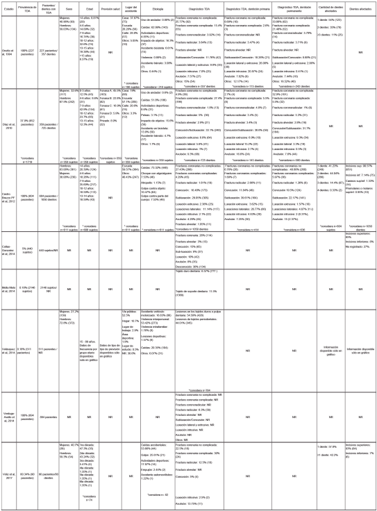 Resultados: Se incluyeron 2 estudios con representatividad nacional y 8 realizados en centros de atención en salud. A nivel nacional, la prevalencia de TDA a los 6 años fue de un 2.57%, y a los 12 años, 4.97%. En los estudios realizados en centros de salud, el diagnóstico más prevalente en dentición primaria fueron las lesiones de tejidos de soporte y en dentición permanente, la fractura coronaria. Fue más frecuente la afectación de un solo diente, y los incisivos centrales superiores fueron los dientes más afectados.