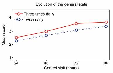The mean values for general state at the different visits, expressed as a score from 0 to 4, are shown in Figure 1. At each visit, the values for the “three times daily” regimen were higher than those of the “twice daily” regimen; as already mentioned, the results at 72 h were the most notable.