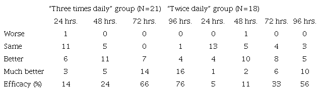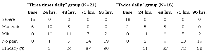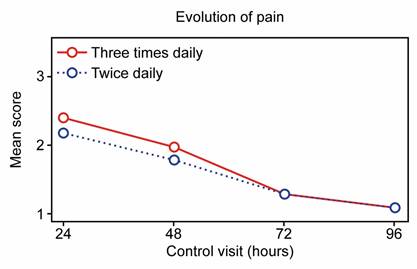 Results: Efficacy to improve the general state was significant superior in “Three time daily” group compared with “twice daily” at 72 h (66% vs 33% respectively). No pain was reported in approximately 90% of cases at 96 h of use in both group without significant differences between the groups in any evaluation time-point.