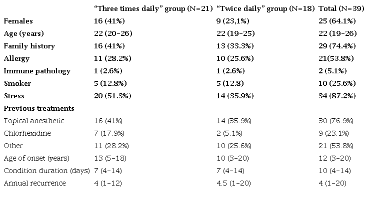 The selected participants for the study meet the following inclusion criteria: acute episode of minor RAS according to Stanley classification10, onset less than 48 hours, previous history of minor RAS, and age between 18 and 26. The exclusion criteria were: systemic disease, major and herpetiform RAS, pregnant or lactating woman, treatment with another mouthwash or any other systemic or topical treatment (including corticosteroids, non-steroidal anti-inflammatory drugs, anesthetics, etc.) the day before or the day of onset. All participants signed an informed consent. The participants were randomly divided into two groups according with the treatment scheme received: Group “Three times daily”: Dentoxol® mouthrinse 5 ml every 8 hrs. for 2 minutes and Group “Twice daily”: Dentoxol® mouthrinse 5 ml every 12 hrs. for 2 minutes.