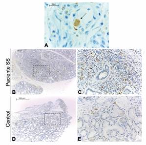 La glicoproteína CD68 se encuentra en la membrana plasmática y citoplasma de Mø y monocitos. En GS labiales de pacientes SS y controles, observamos que la señal inmunohistoquímica se encontró en ambas localizaciones en células que presentan morfología de Mø (Figura 1 A). Sólo un individuo fue negativo para la inmunotinción.