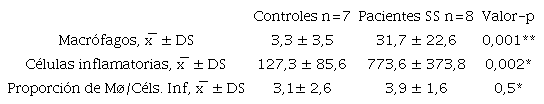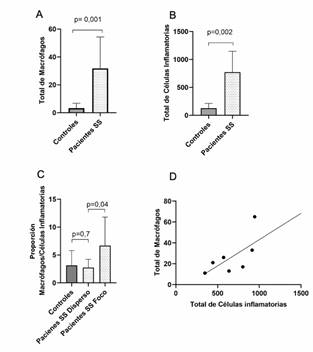 Al comparar el número de Mø entre ambos grupos, se encontró que los pacientes presentaron 9 veces más Mø que los controles (valor-p=0.001) (Tabla 2, Figura 2A). El número de células inflamatorias totales también fue mayor en pacientes en comparación con controles (valor-p=0,002)(Tabla 2, Figura 2B). Posteriormente, se comparó la proporción de Mø presentes en las glándulas salivales labiales de pacientes SS e individuos controles, no encontrando diferencias significativas (valor-p=0,5) (Tabla 2).