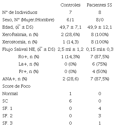 La muestra fue reclutada por conveniencia. La glándulas salivales labiales (GSL) fueron obtenidas de 15 individuos. Ocho pacientes fueron diagnosticados con síndrome de Sjögren primario siguiendo los criterios de clasificación propuestos por el Consenso Americano-Europeo del 20025 y siete individuos controles, que presentaban sintomatología sicca (xerostomía y ojo seco), y que no cumplían con los criterios de clasificación diagnóstica para SS (ver Tabla 1) y cuyo estudio histopatológico de la glándula salival labial era normal o presentaba sialoadenitis crónica difusa leve. Se excluyeron individuos con radioterapia de cabeza y cuello, Infección por virus de la hepatitis C, síndrome de inmunodeficiencia adquirida, linfoma preexistente, sarcoidosis, enfermedad de injerto contra huésped o que utilizaran medicamentos anticolinérgicos.