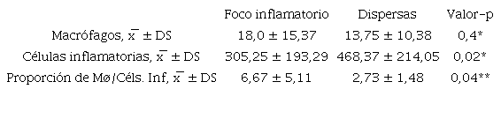 Al comparar la proporción de Mø dispersos (fuera del foco periductal) en las GS labiales de los pacientes SS y el total de Mø (dispersos en toda la glándula) en individuos controles, no se encontraron diferencias estadísticamente significativas (valor-p=0,7) (Figura 2 C). Además, al comparar la proporción de Mø en el foco inflamatorio periductal versus los dispersos en el estroma glandular en los pacientes SS, encontramos una mayor proporción de Mø en el infiltrado periductal (valor-p=0,04) (Tabla 3, Figura 2 C). Cabe destacar el gran infiltrado inflamatorio disperso que también presentan los pacientes SS (Tabla 3).
