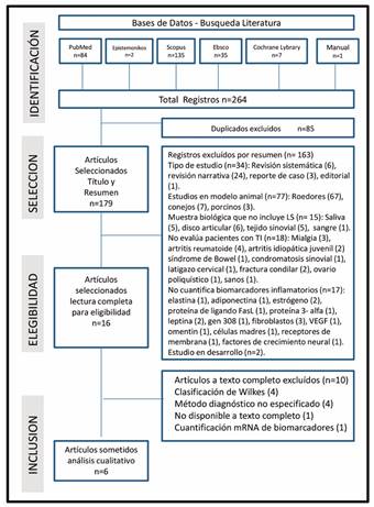 Criterios inclusión-exclusión. Los criterios de inclusión fueron ensayos clínicos aleatorizados (ECA) y estudios observacionales de corte transversal (OCT) a texto completo, publicados en idioma inglés o español, efectuados en humanos adultos (≥18 años) con trastornos intraarticulares (TI) tipo osteoartritis (OA) y/o desplazamientos discales (DD) de la ATM, diagnosticados mediante los criterios RDC/TMD o DC/TMD y/o técnicas imagenológicas (RM o TAC), sometidos a colección de LS y evaluación de la presencia de biomarcadores inflamatorios, expresados en picogramo por mililitro (pg/mL). Los criterios de exclusión fueron: opiniones de expertos, revisiones y estudios en cadáveres, en pacientes con TI de la ATM asociado a otras patologías y muestras biológicas evaluadas en disco articular, suero, saliva u orina.