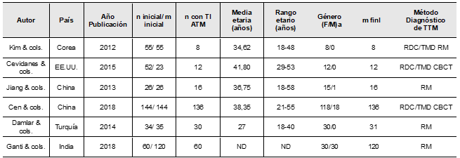 Los criterios diagnósticos RDC/TMD fueron utilizados en tres estudios5,12,14, la resonancia magnética en 4 10-12,15 y CBCT en 2 estudios5,14 (Tabla 1).