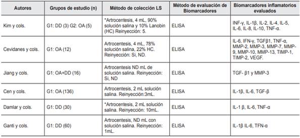 En todos los estudios los niveles de biomarcadores fueron evaluados en LS mediante ensayos de inmunoabsorción ligados a enzimas (ELISA)5,11,12,14,15 que en total evaluaron 19 diferentes biomarcadores (Tabla 2).
