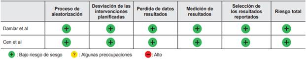 La evaluación Cochrane RoB 2 se realizó en sus 5 parámetros aplicando sus tres opciones de respuesta: bajo, moderada o alto riesgo de sesgo.