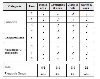 Para la evaluación de los estudios de corte transversal, se utilizó la escala de Newcastle-Ottawa (NOS) en sus 8 ítems, divididos en sus tres categorías, interpretándose 7 o más estrellas como bajo riesgo de sesgo y de 0-7 como alto riesgo de sesgo.