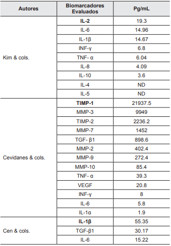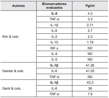 La variabilidad en los resultados de los niveles de los biomarcadores IL-1β e IL-6 (evaluados en la mayoría de los estudios)10,12,14,15, se podría explicar por la inconsistencia en el protocolo de muestreo. Alstergren & cols25 analizan que la calidad de la muestra difiere por factores como: contaminación sanguínea, volumen de solución aspirada o factores de solución y describe la importancia de analizar la calidad de la muestra para excluir muestras inadecuadas. Los criterios de Alstergren & cols. solamente fueron considerados por Kim & cols.12. No se entrega información del uso de estos criterios en el resto de los estudios, a excepción de Damlar & cols.10, que excluyen las muestras contaminadas.