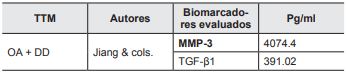 Solo un estudio evaluó pacientes (n=16) con ambas patologías (OA+DD), 15 mujeres (94%), (=36,75 años), en los biomarcadores TGF-β1 y MMP-3 (detectado en mayor concentración) (Tabla 5C)11.
