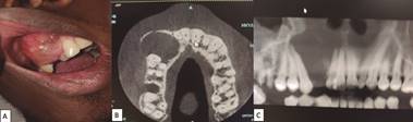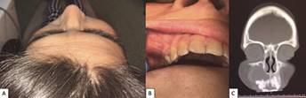 Al examen facial se observa aumento de volumen en región hemimaxilar derecha, de límites netos, bien circunscrito, con esfumamiento del surco nasogeniano, sin compromiso de piel. Al examen intraoral, se observa vestíbulo ocupado en relación con dientes 1.4, 1.3, 1.2 y 1.1, los que desplaza, cubierto por mucosa normal, de 2x3cm aproximadamente, consistencia dura, indoloro a la palpación (Figura 5a). En la Tomografía Computada Cone Beam se observó una lesión hipodensa, localizada en zona maxilar superior derecha, en relación con dientes 1.4, 1.3, 1.2 y 1.1 de límites definidos, bordes corticalizados, que expande y adelgaza tabla vestibular la que se observa fina y discontinua en algunas zonas, que provoca desplazamiento de raíces de los dientes 1.2 y 1.3, sin producir rizálisis (Figura 5b y 5c).