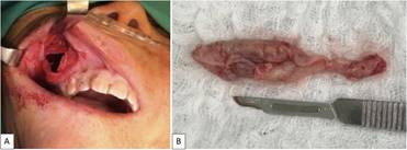 Se planifica biopsia incisional con hipótesis diagnóstica de queratoquiste odontogénico. Bajo sedación y anestesia local se realiza acceso transoral vestibular maxilar, con buen plano de clivaje, ya que, la membrana no se disgrega y se realiza exéresis aparentemente completa de la lesión, finalmente se realiza aseo de lecho óseo e instalación de cánula de descompresión (Figura 2).