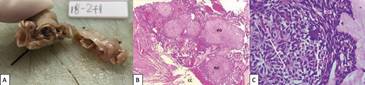Macroscópicamente se describe una membrana quística ovalada, superficie lisa, lobulada, color blanco grisáceo, blanda, que mide 32x23x10mm. Al dividirla se observa en el interior sustancia de aspecto pastoso firme, pardo, ovalada (Figura 3a). Microscópicamente se observan cortes con múltiples cavidades quísticas de gran extensión, compuestas por un epitelio cúbico que varía de 2-3 capas, hasta zonas de 10-12 células, con crecimiento mural. Destaca zona de proliferación de epitelio odontogénico, con patrón de rosetas, bandas arremolinadas y zonas de microquistes, similares a conductos cortados transversalmente, rodeados por células cilíndricas que recuerdan ameloblastos. Entre estas zonas arremolinadas se observa material eosinófilo homogéneo y escasos fragmentos de calcificaciones amorfas. En un segmento de la muestra, se observa a estos conglomerados en relación directa con la membrana quística, proliferando hacia ella con un patrón más plexiforme.