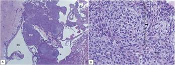En el examen macroscópico se reciben tres muestras, muestra mayor con apariencia de membrana quística, blanda, de color blanco amarillento, superficie lisa, que mide 55 x 30 x 18 mm. Se divide en fragmentos de 5 mm. aproximadamente, evidenciando una sustancia pastosa y granular en su interior, de color café, que mide 10 mm. Al examen microscópico se observan múltiples cortes con fragmentos de membranas quísticas revestidas por un epitelio de células cúbicas, cilíndricas, con grosor que varía de 2-3 capas hasta 15 células, en algunas zonas con patrón de crecimiento mural. Destaca adosado a la membrana, y como continuación de el mismo epitelio, una zona de proliferación de epitelio odontogénico con patrón de rosetas y de bandas arremolinadas y algunas zonas de microquistes, formadas por células que recuerdan ameloblastos. Entre las zonas arremolinadas hay restos de hemosiderina y fragmentos con calcificaciones amorfas. En algunos sectores prolifera con patrón plexiforme. Se observan fragmentos de tejido óseo vital entre tejido conectivo fibroso denso (Figura 6).
